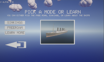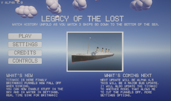 Hello, this is a remake of a game I worked on in high school and could never finish. I decided to remake it cause I want to get back into making video games. This game is about the Titanic, Lusitania, and the Britannic. You can choose a theory of how the ship went down. If you want to know what update is out, check here, or there is a road map that tells you what update is next. Also, one more thing, this game is in Alpha, so it is very unfinished.